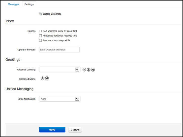 You configure voicemail using the Messages page. This page has two tabs for handling voicemail: