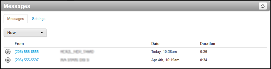 The Messages tab allows you to manage your new, saved, and deleted voicemail, as well as greetings and other settings.
