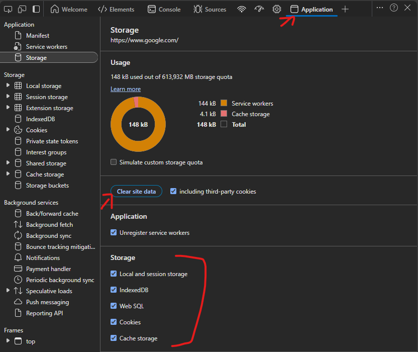 On the left sidebar, under “Storage”, click “Clear storage”.