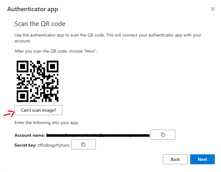 - Now you will see QR Code you can scan, underneath you will have option to click "Can't Scan Image?", click on it and you will have the Secret key that you can copy and save, also you can take photo or screenshot of QR Code to share with other users